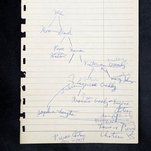 Genealogical Tree: "Me," "Mom," "Dad," "Papa Hana Hatter," "Victoria Crealey," "Eugene Creadly," "Mary Johnson," "Francis Grealey," "Eugene Chouteau," "Sophia-daughter," and "Pierre Chouteau." The note "Pierre Chouteau born in 1819" is at the bottom. A separate note reads "Auguste Sophie Chouteau & Labadie," with an arrow pointing to "Pierre Chouteau."
