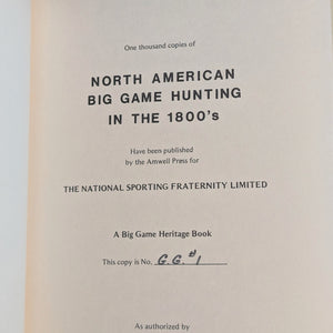 One thousand copies of NORTH AMERICAN BIG GAME HUNTING IN THE 1800's Have been published by The Amwell Press for THE NATIONAL SPORTING FRATERNITY LIMITED A Big Game Heritage Book This copy is No. G.G. #1 As authorized by [Signature of John E. Howard] John E. Howard [Signature of Irene Bowers] Irene Bowers [Signature of Jim Rikhoff] Jim Rikhoff, President, NSFL