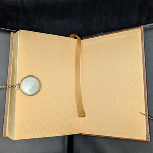 This book is a genuine and handsome survivor, showing the authentic wear of a cherished volume. The genuine leather-look binding is in excellent condition with vibrant gilt lettering and design. The book has been preserved in its pristine state due to the presence of its protective slipcase, which shows some minor signs of wear consistent with its age.
