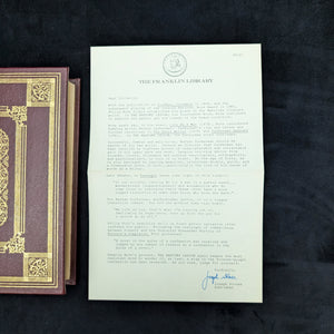This book contains a personal autograph from the author on a blank endpaper. The signature is in black ink, consistent with other known examples of Roth’s handwriting. The presence of the autograph documents the book as a unique and personal artifact. The book also contains a collector's letter from The Franklin Library, which details the book’s limited edition status.